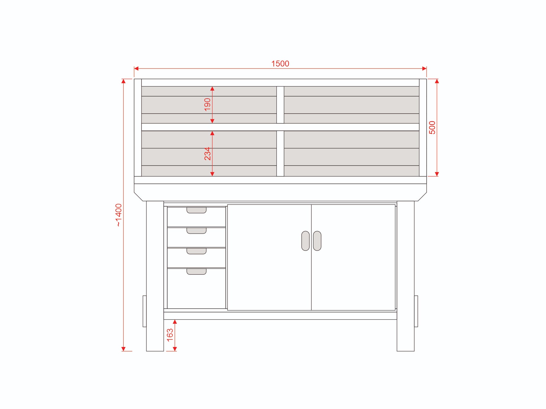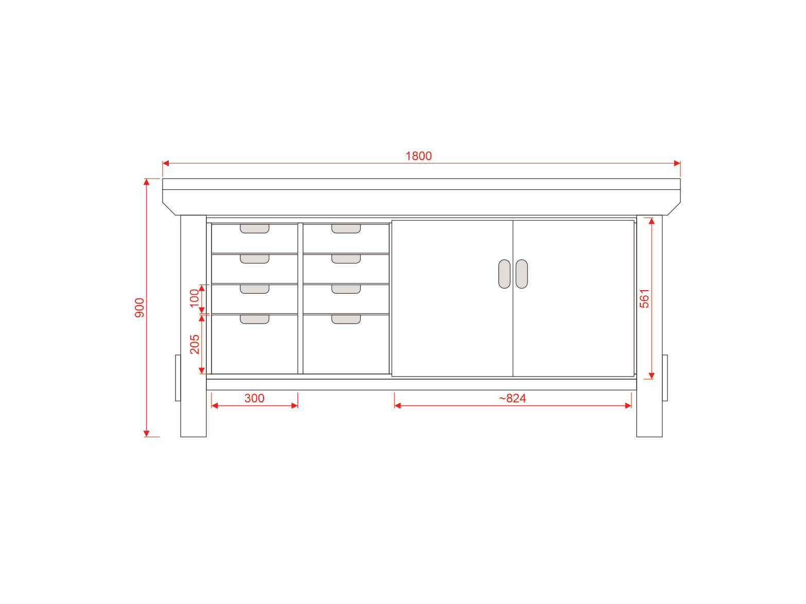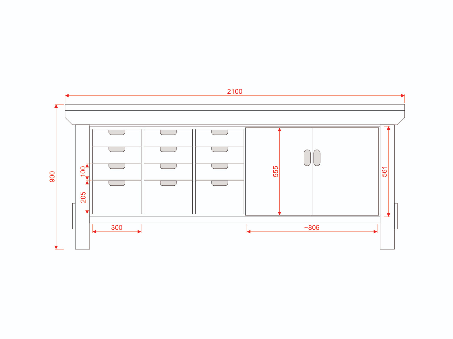 This workbench is available in multiple sizes, ranging from 1500mm to 2100mm in width, with a standard height of 900mm and depth of 640mm. Each unit is beautifully finished, reflecting quality craftsmanship and attention to detail.
