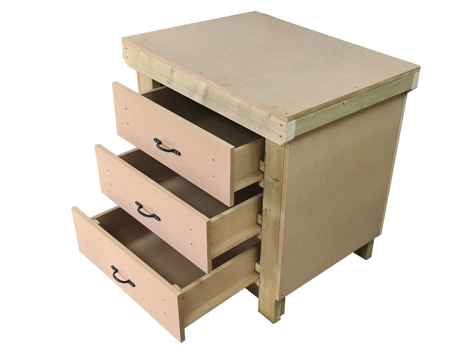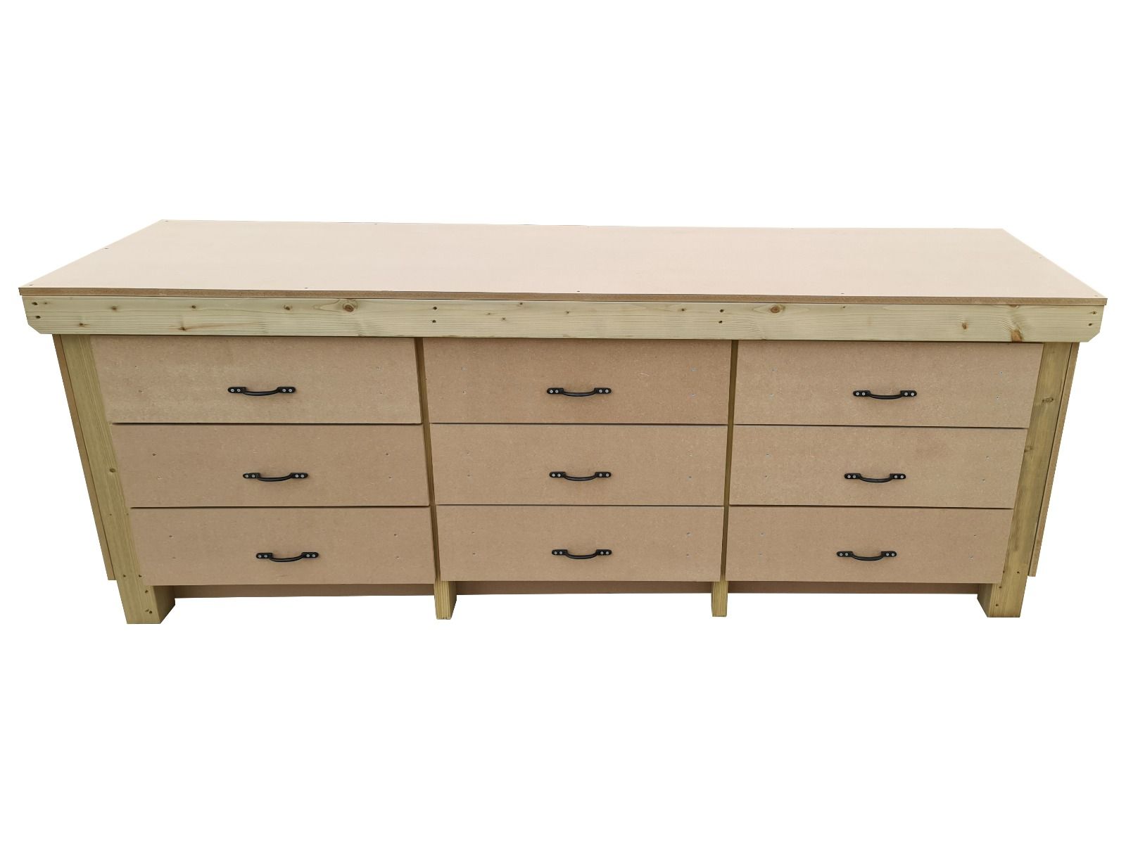 Our Tool Cabinet Workbench Wooden 18mm MDF Top is designed to meet the demands of various applications, providing a sturdy and reliable workspace. The frame is constructed from high-quality CLS C16 kiln-dried timber, ensuring structural integrity and longevity. The 18mm MDF work surface offers a smooth and durable platform for all your projects. Depending on the chosen length, the workbench includes up to nine spacious drawers, allowing for organized storage of tools and materials. Handmade in the UK, each bench is supplied in knockdown form for easy on-site assembly, requiring only a screwdriver for setup.