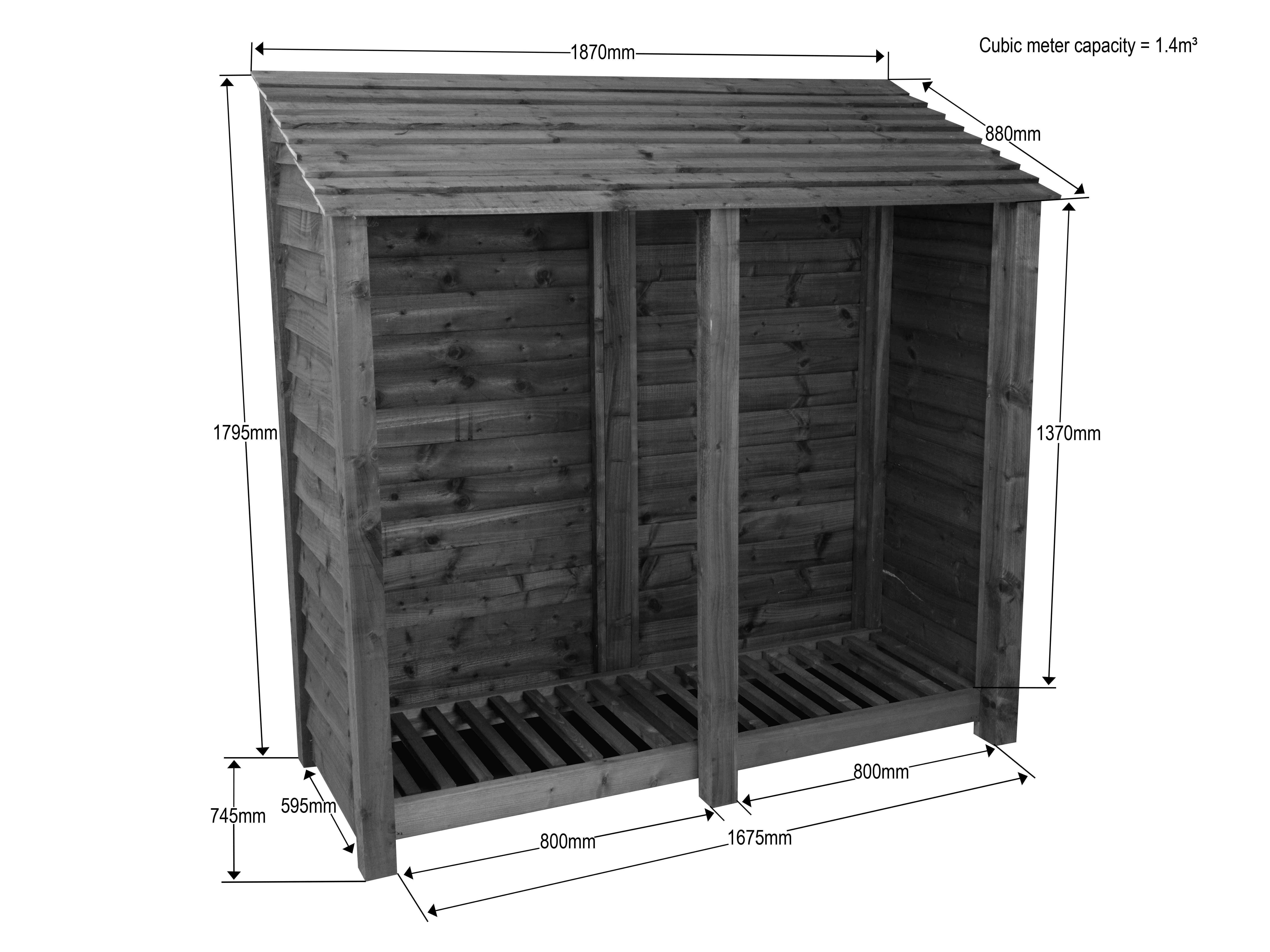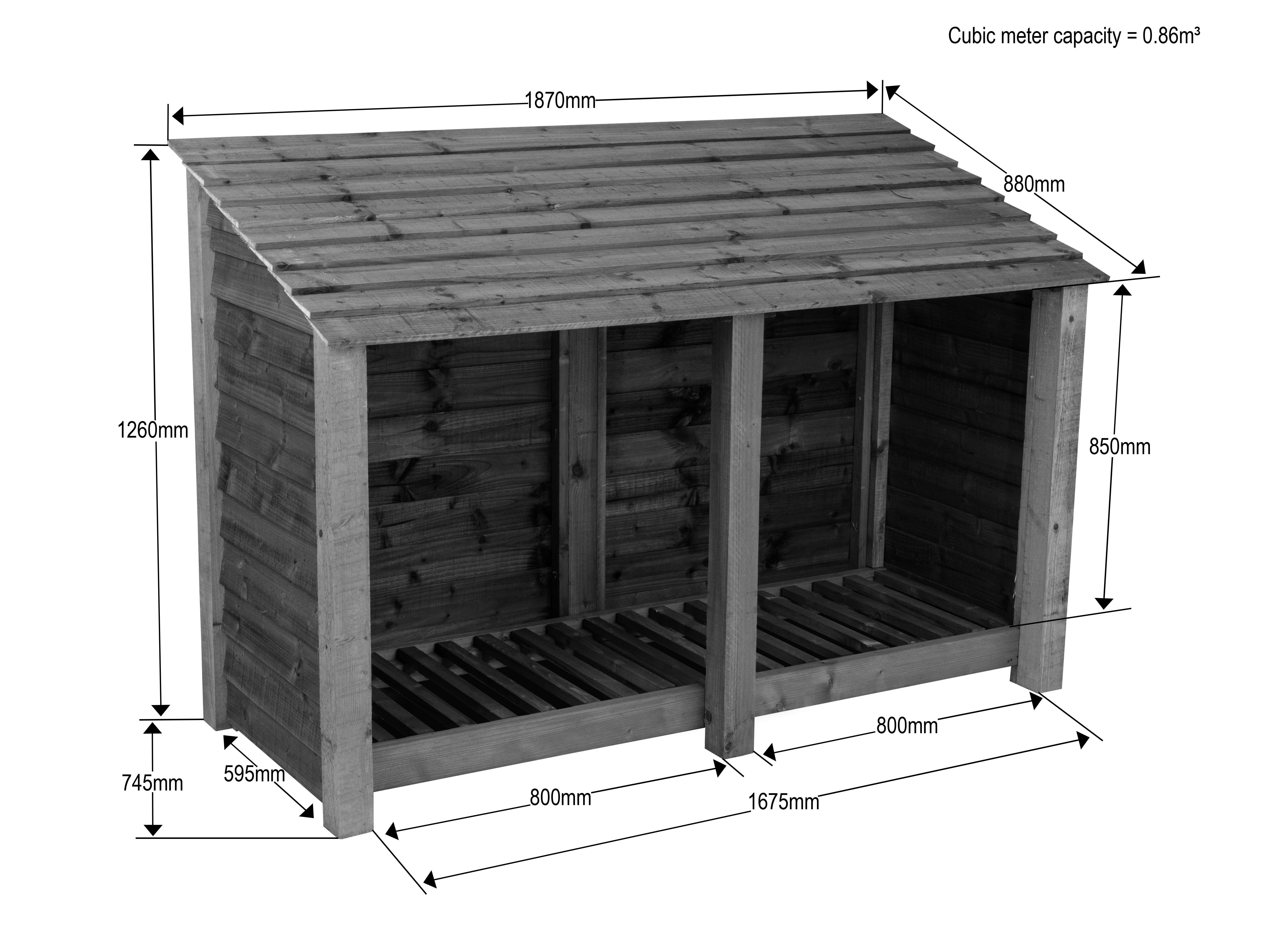 The Double bay Log Store is engineered for optimal firewood storage and seasoning. Constructed from pressure-treated, construction-grade timber, it ensures durability and resistance to decay. The design features slatted sides and a raised base, promoting air circulation to effectively reduce moisture content in logs. A sloped roof facilitates efficient water runoff, safeguarding the wood from precipitation. All provided fixings are corrosion-resistant, enhancing the structure's longevity. This log store offers a practical solution for maintaining a dry and organized firewood supply.