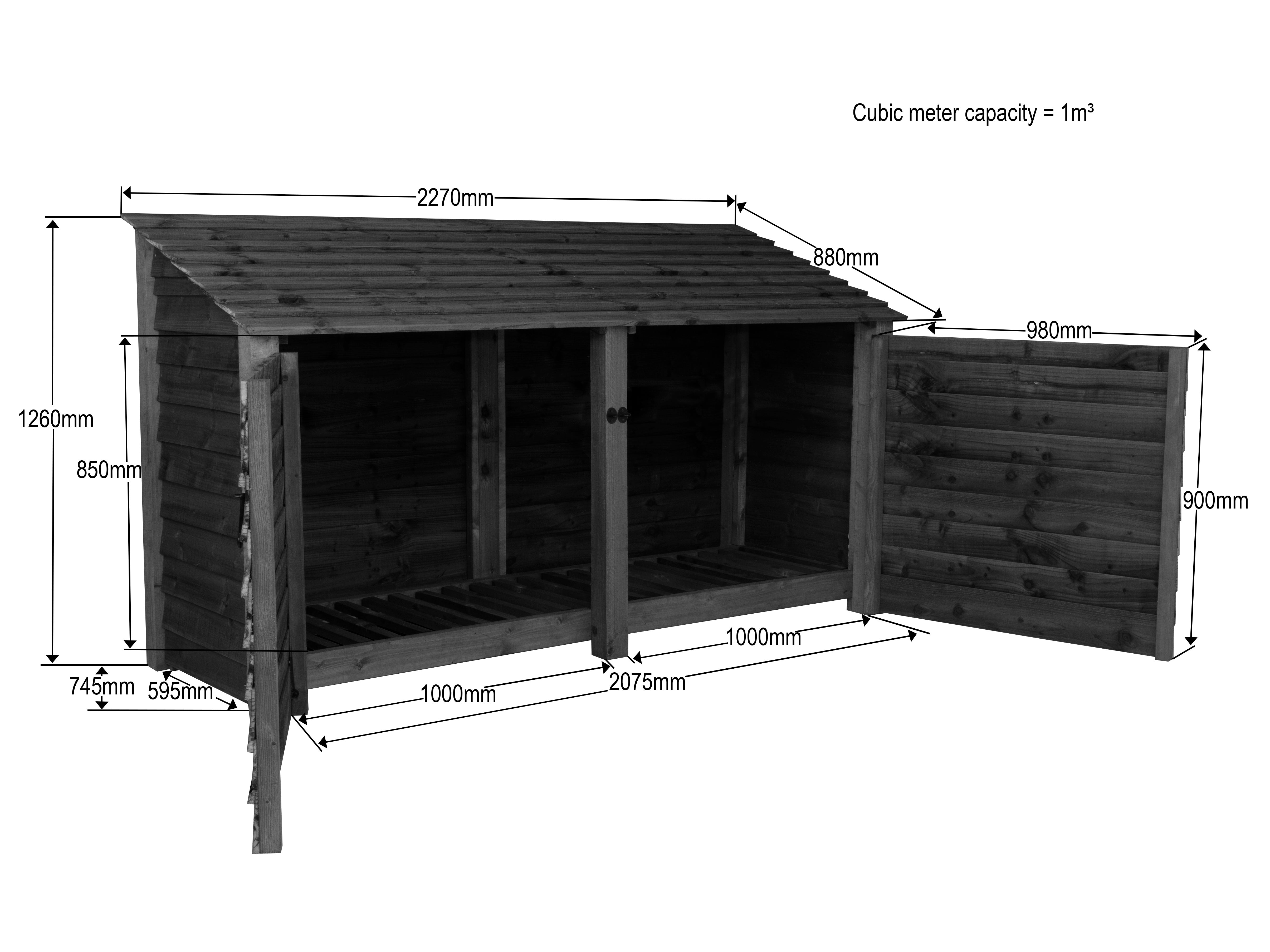 The Double bay Log Store is engineered for optimal firewood storage and seasoning. Constructed from pressure-treated, construction-grade timber, it ensures durability and resistance to decay. The design features slatted sides and a raised base, promoting air circulation to effectively reduce moisture content in logs. A sloped roof facilitates efficient water runoff, safeguarding the wood from precipitation. All provided fixings are corrosion-resistant, enhancing the structure's longevity. This log store offers a practical solution for maintaining a dry and organized firewood supply.
