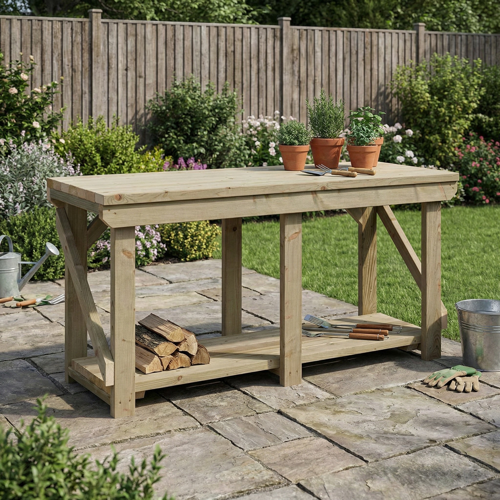 Read more about our environmental policies - Our Indoor/Outdoor Workbenches are constructed from high-quality pressure-treated timber, renowned for its durability and resistance to decay, insects, and moisture. This treatment ensures the wood withstands various environmental conditions, making it ideal for both indoor and outdoor use. Over time, pressure-treated wood may develop a natural patina, which does not compromise its structural integrity. To maintain its appearance and prolong its lifespan, we recommend applying a suitable wood preservative or sealant annually. This practice helps protect the wood from weathering and keeps your workbench looking its best for years to come. Additionally, regular maintenance, such as cleaning and inspecting for any signs of wear, will ensure the workbench remains a reliable and attractive addition to your workspace. By following these care guidelines, you can enjoy the benefits of a sturdy and long-lasting workbench tailored to your indoor and outdoor project needs.