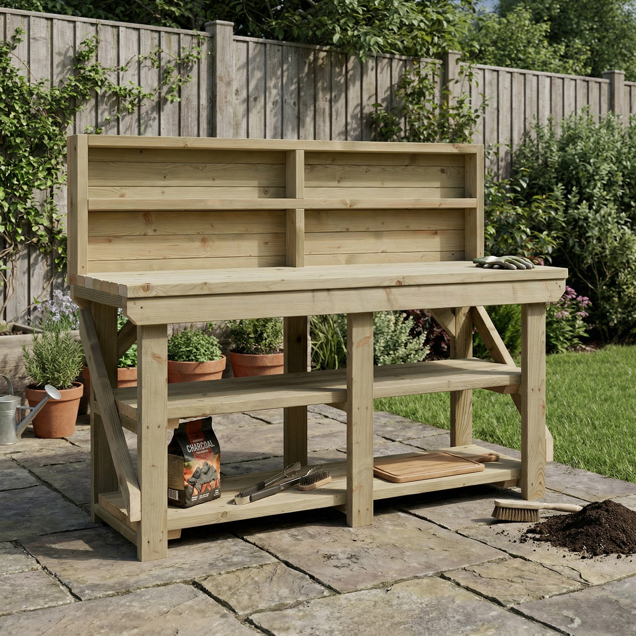 Indoor/outdoor workbench, pressure treated bench with back panel and double shelf