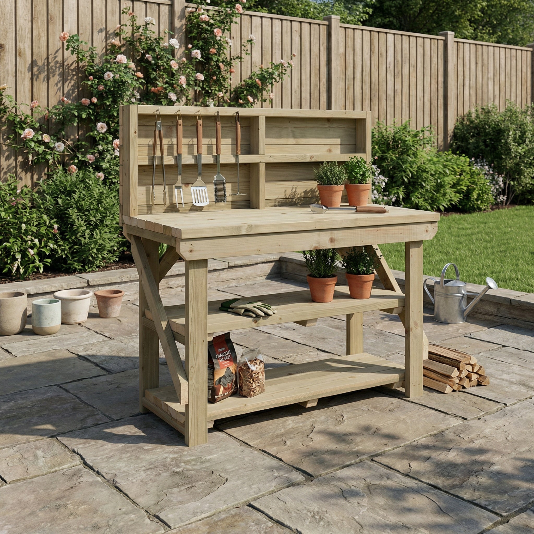 Read more about our environmental policies - Our Indoor/Outdoor Workbenches are constructed from high-quality pressure-treated timber, renowned for its durability and resistance to decay, insects, and moisture. This treatment ensures the wood withstands various environmental conditions, making it ideal for both indoor and outdoor use. Over time, pressure-treated wood may develop a natural patina, which does not compromise its structural integrity. To maintain its appearance and prolong its lifespan, we recommend applying a suitable wood preservative or sealant annually. This practice helps protect the wood from weathering and keeps your workbench looking its best for years to come. Additionally, regular maintenance, such as cleaning and inspecting for any signs of wear, will ensure the workbench remains a reliable and attractive addition to your workspace. By following these care guidelines, you can enjoy the benefits of a sturdy and long-lasting workbench tailored to your indoor and outdoor project needs.