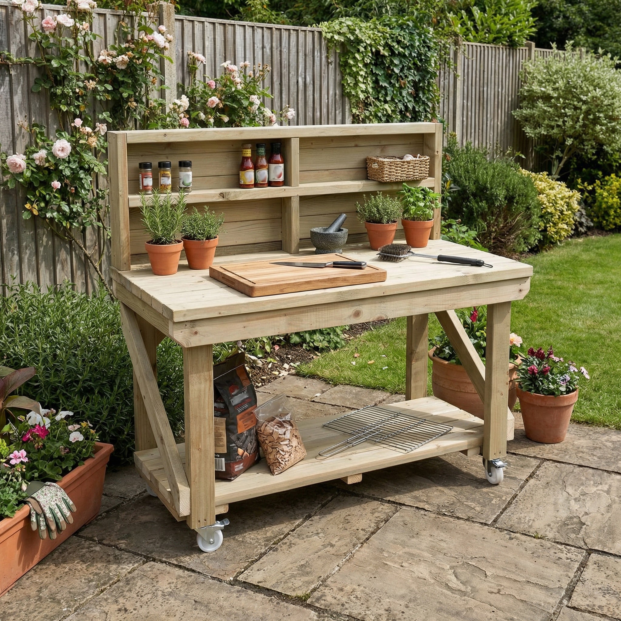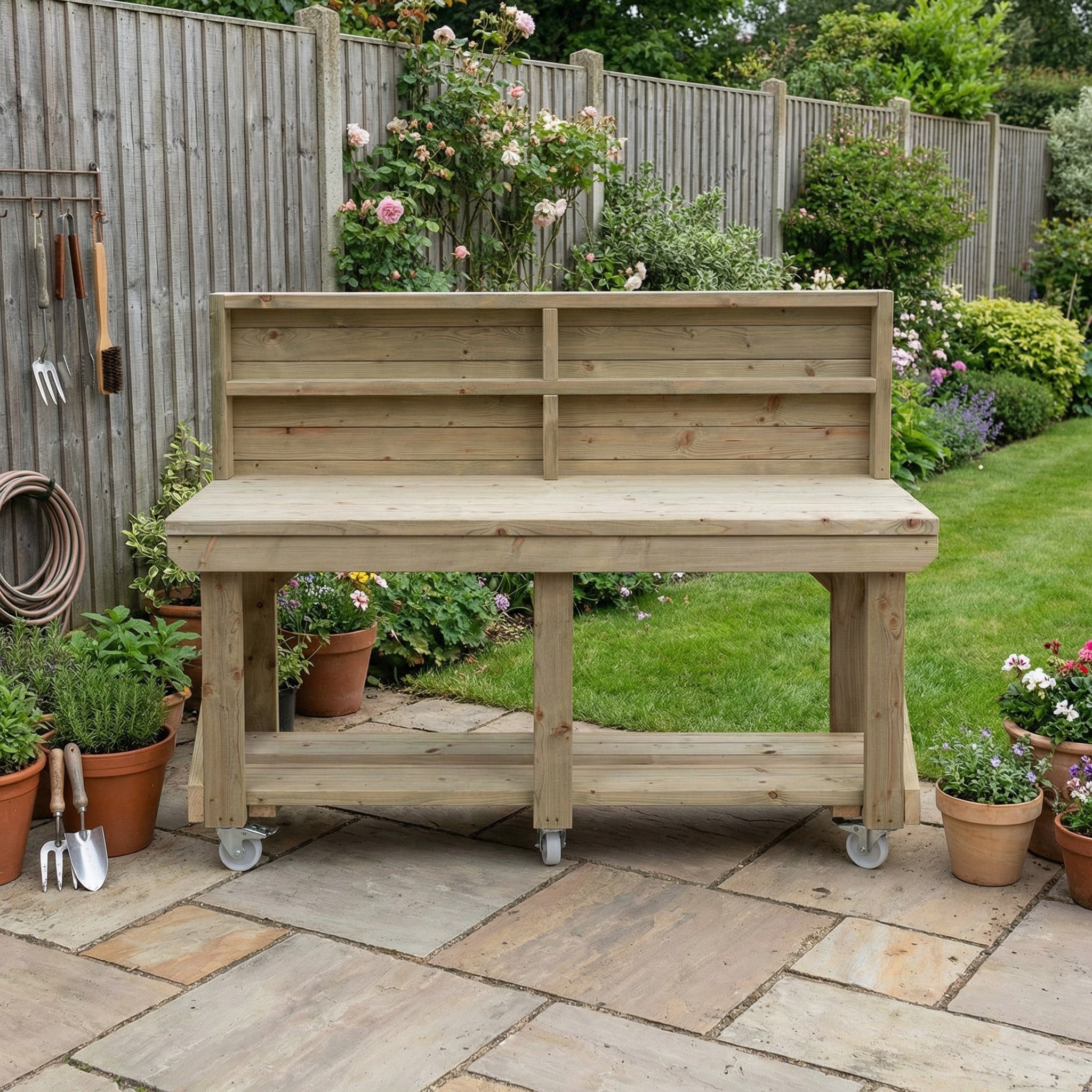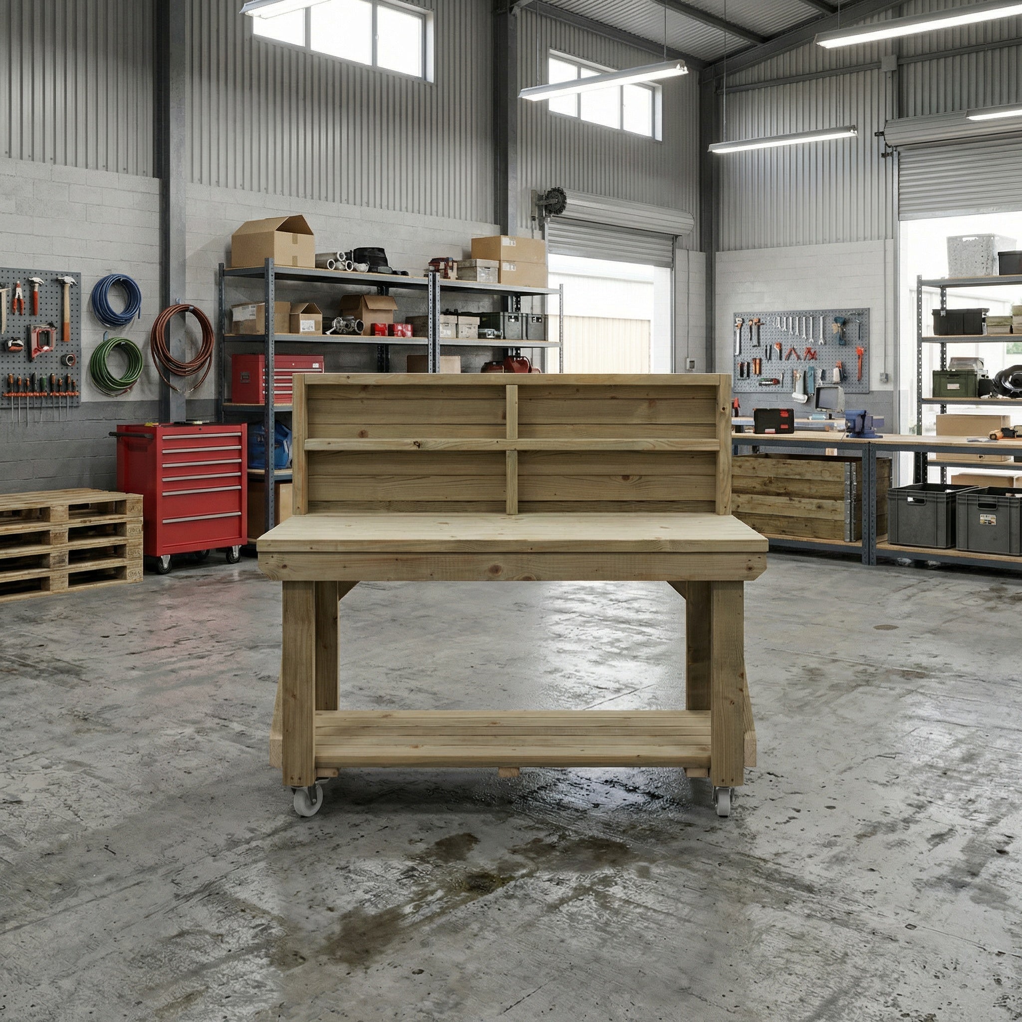 Indoor/outdoor workbench, pressure treated bench with back panel and wheels
