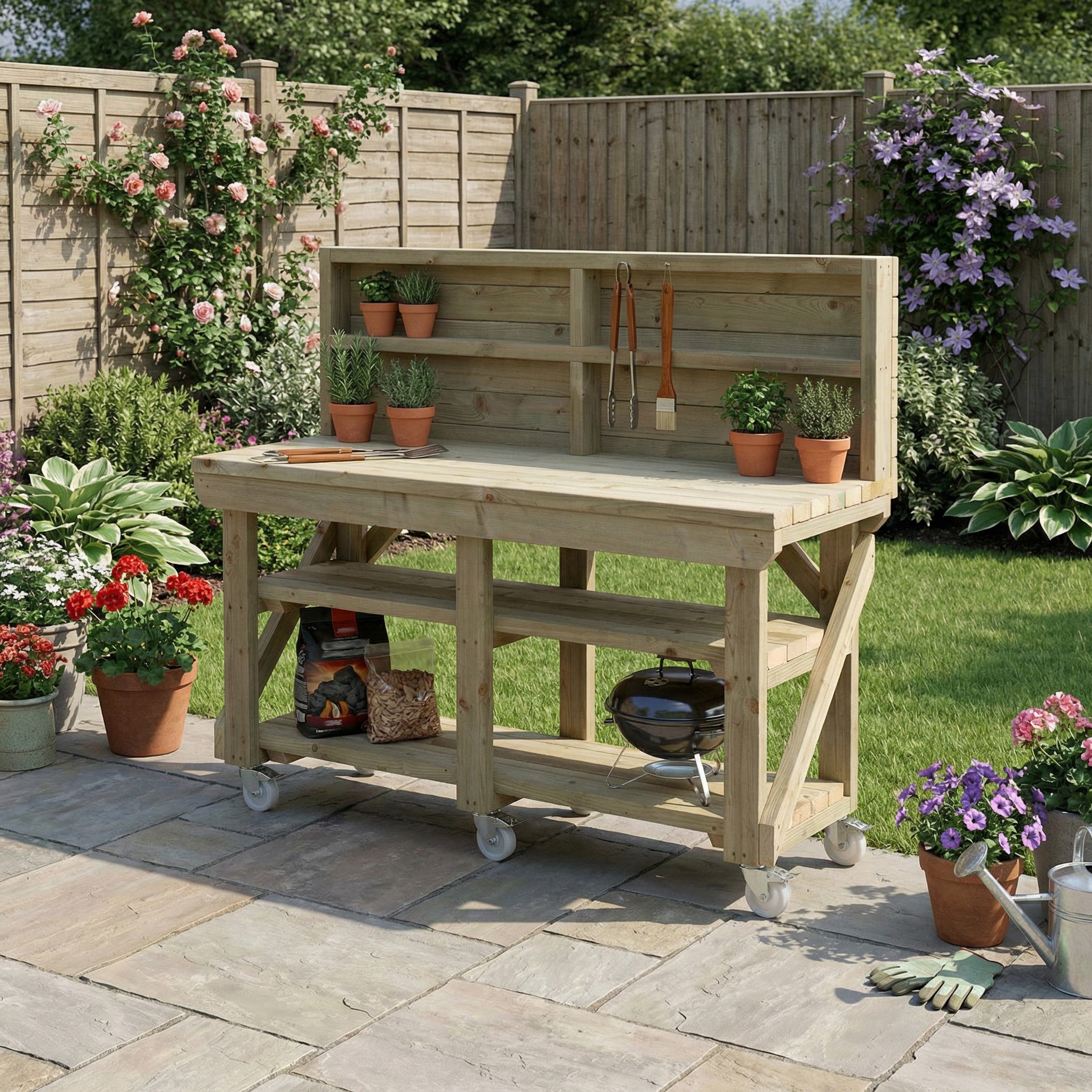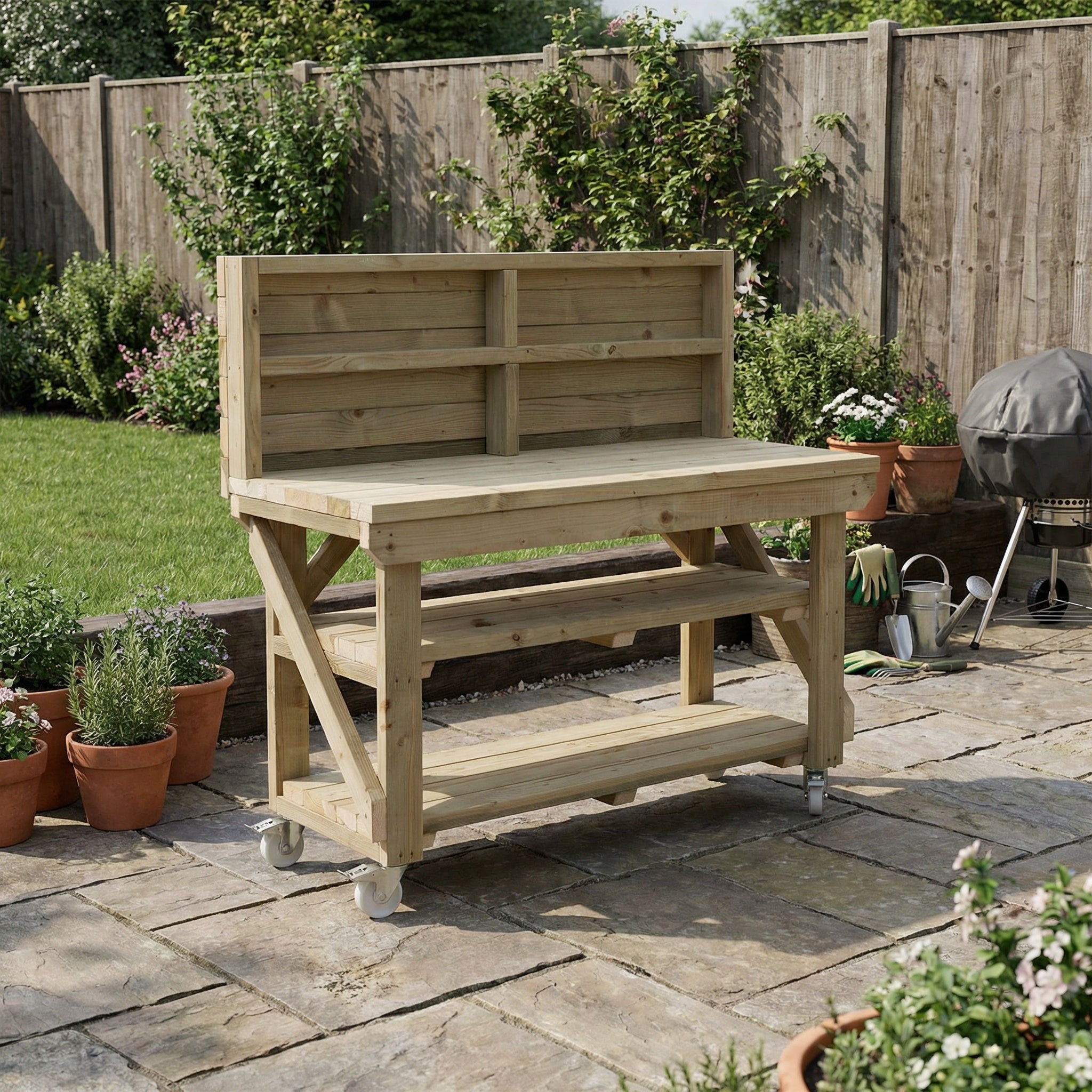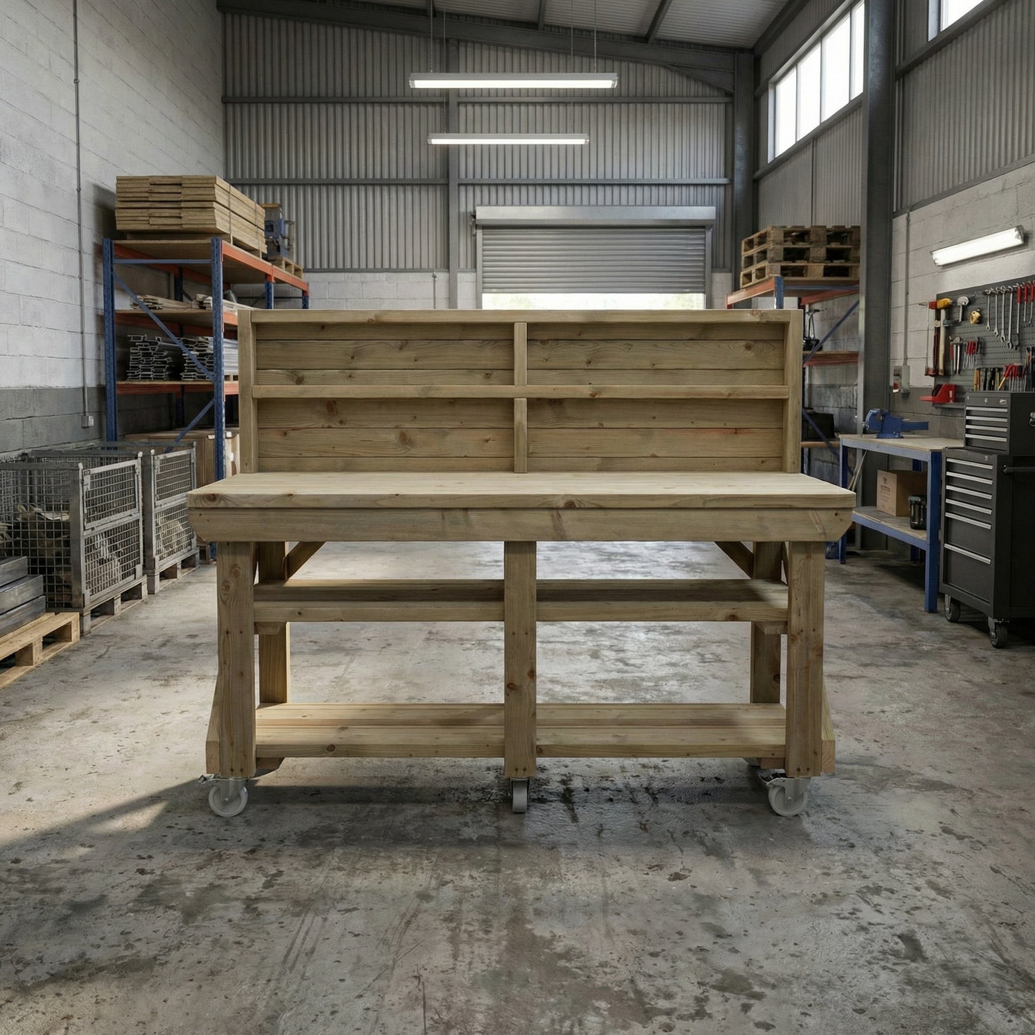 Indoor/outdoor workbench, pressure treated bench with back panel, double shelf and wheels