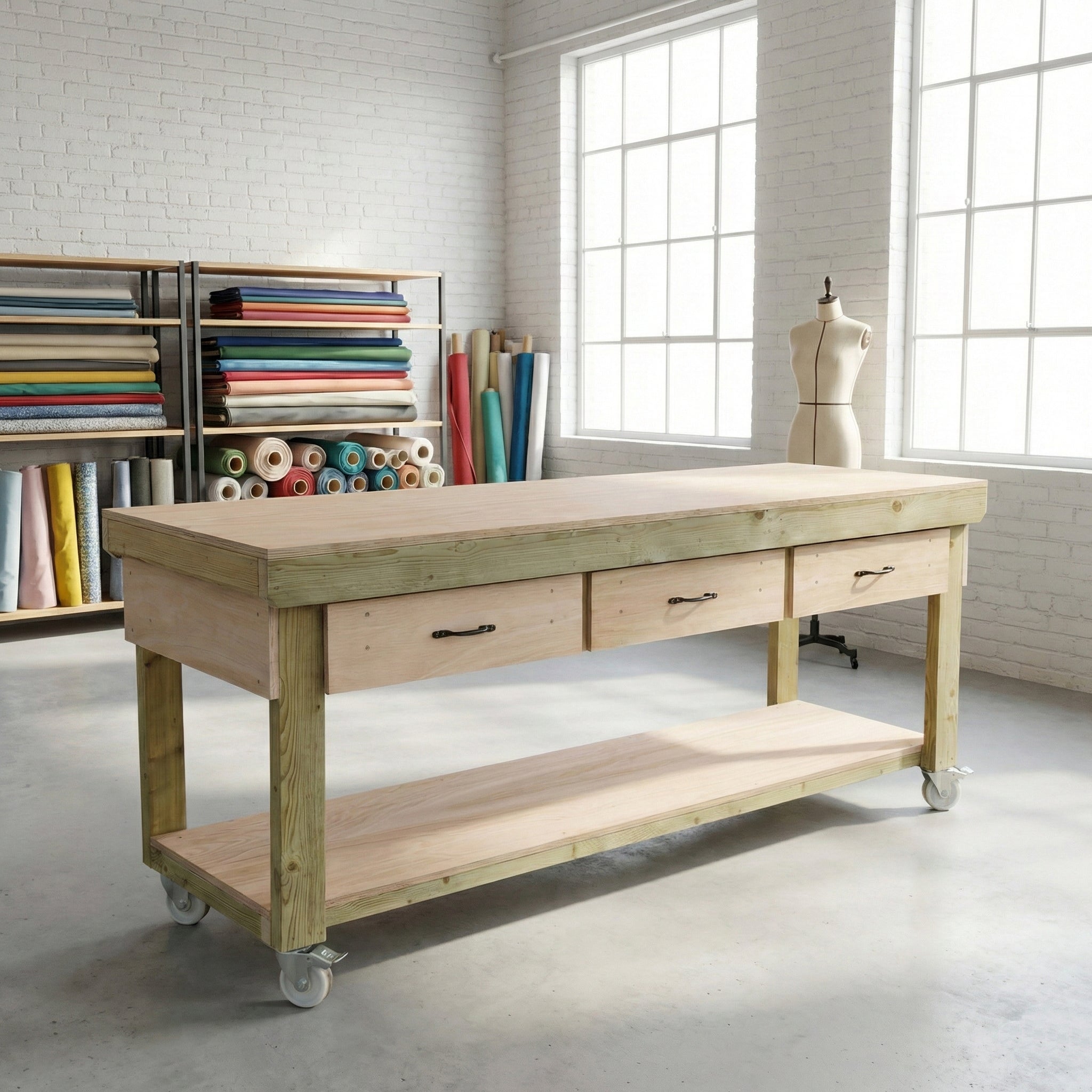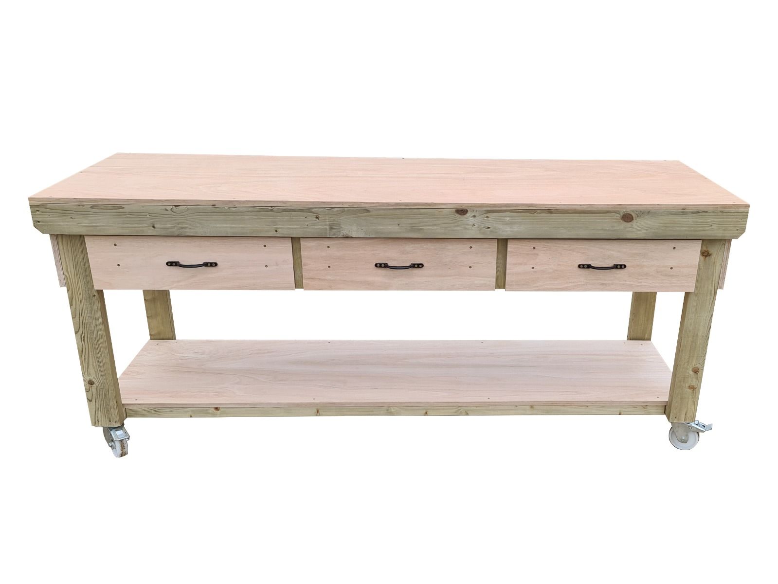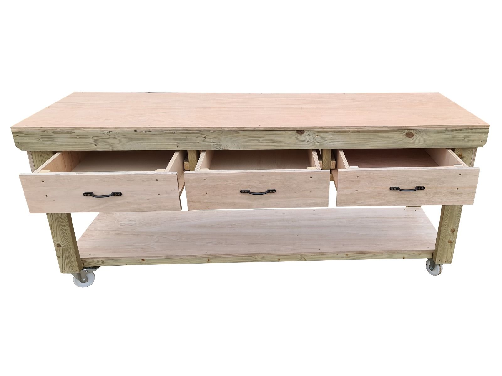 Our Wooden Workbench with Drawers and Eucalyptus Hardwood Top is meticulously designed to provide a robust and dependable workspace for various applications. The frame is constructed from high-quality CLS C16 kiln-dried timber, ensuring structural integrity and longevity. The 18mm eucalyptus hardwood plywood work surface offers a durable and smooth platform for all your projects. Depending on the chosen length, the workbench includes up to three spacious drawers, allowing for organized storage of tools and materials. Handmade in the UK, each bench is supplied in knockdown form for easy on-site assembly, requiring only a screwdriver for setup.
