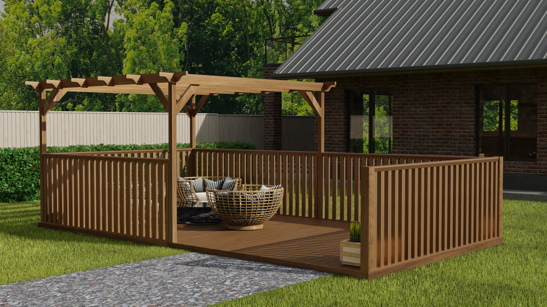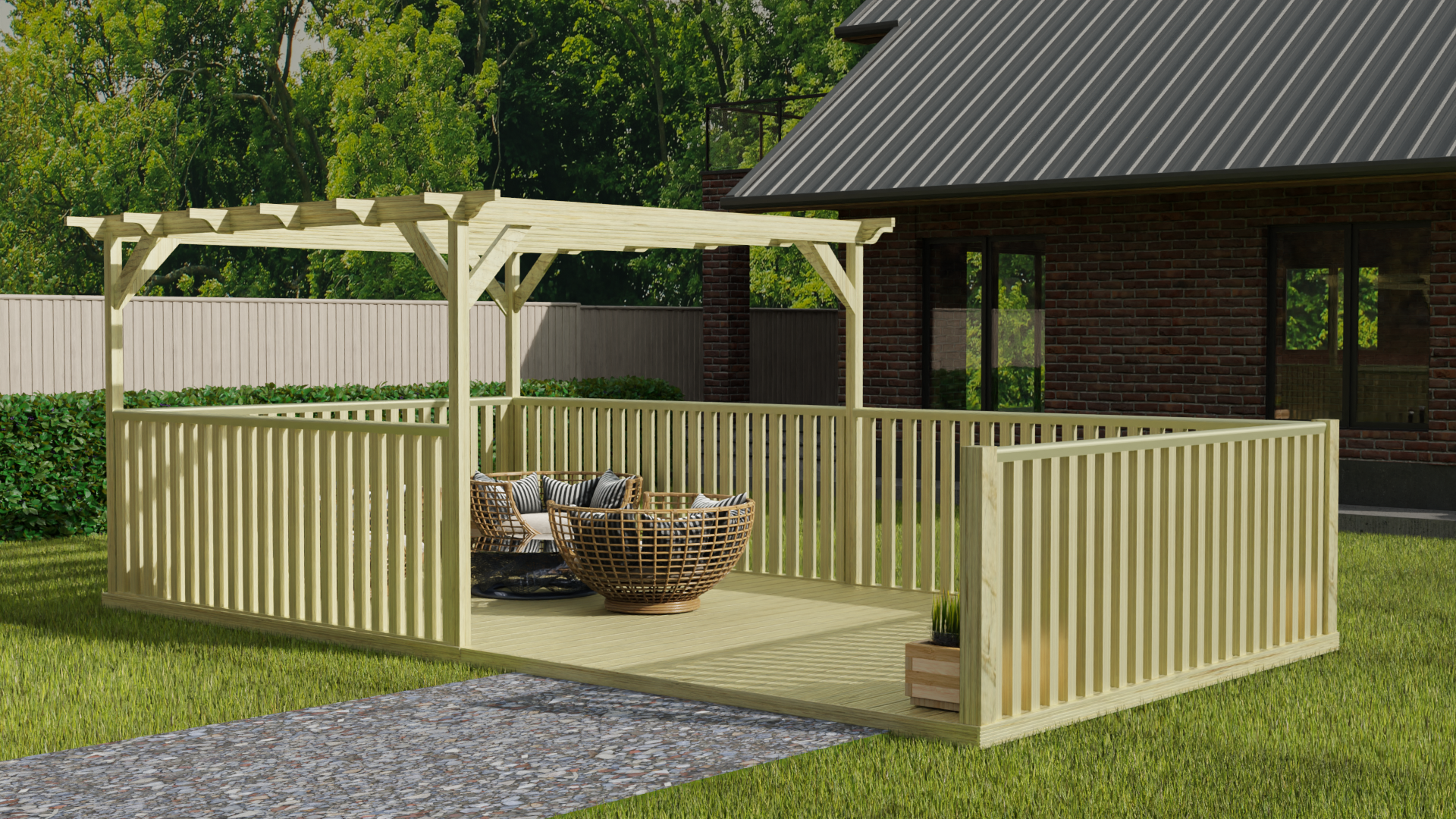 Enhance your outdoor living space with our Pergola and Decking Kit with Balustrade. This comprehensive kit combines functionality and elegance, providing a safe and stylish area for relaxation and entertainment.