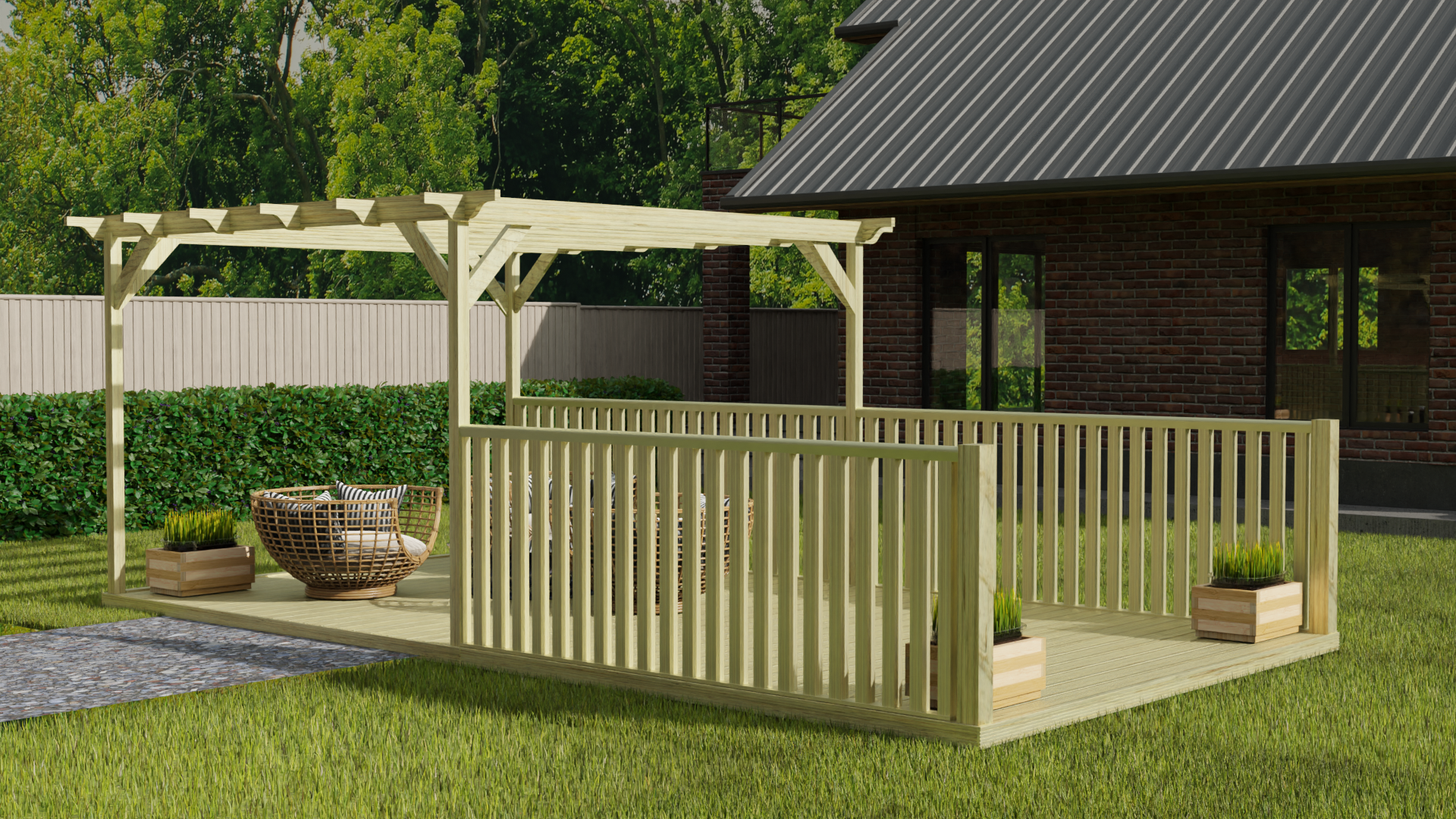 Enhance your outdoor living space with our Pergola and Decking Kit with Balustrade. This comprehensive kit combines functionality and elegance, providing a safe and stylish area for relaxation and entertainment.