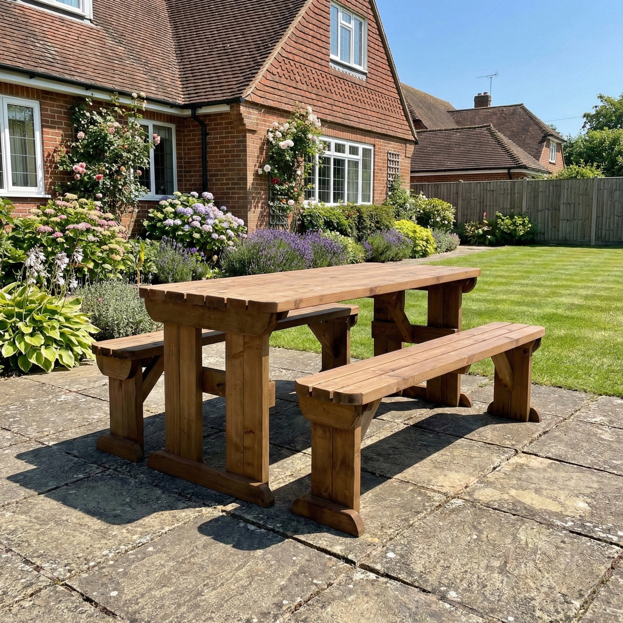 It features a 41mm parasol hole, making it ideal for shaded outdoor dining, while corrosion-resistant fixings and black cover caps on visible bolts ensure safety and a polished look. For added stability, the 8ft bench option includes a third middle leg. This classic wooden picnic table and bench set is designed for comfort, strength, and timeless outdoor appeal.