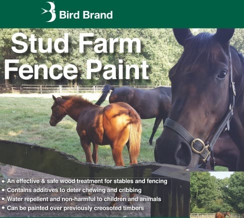 Stop horses chewing and cribbing stable timbers by using Bird Brand Stud Farm Fence Paint. It is a new, environmentally friendly alternative to creosote. It contains carefully selected additives to discourage horses from biting, chewing and cribbing timbers around stables/paddocks/rings.