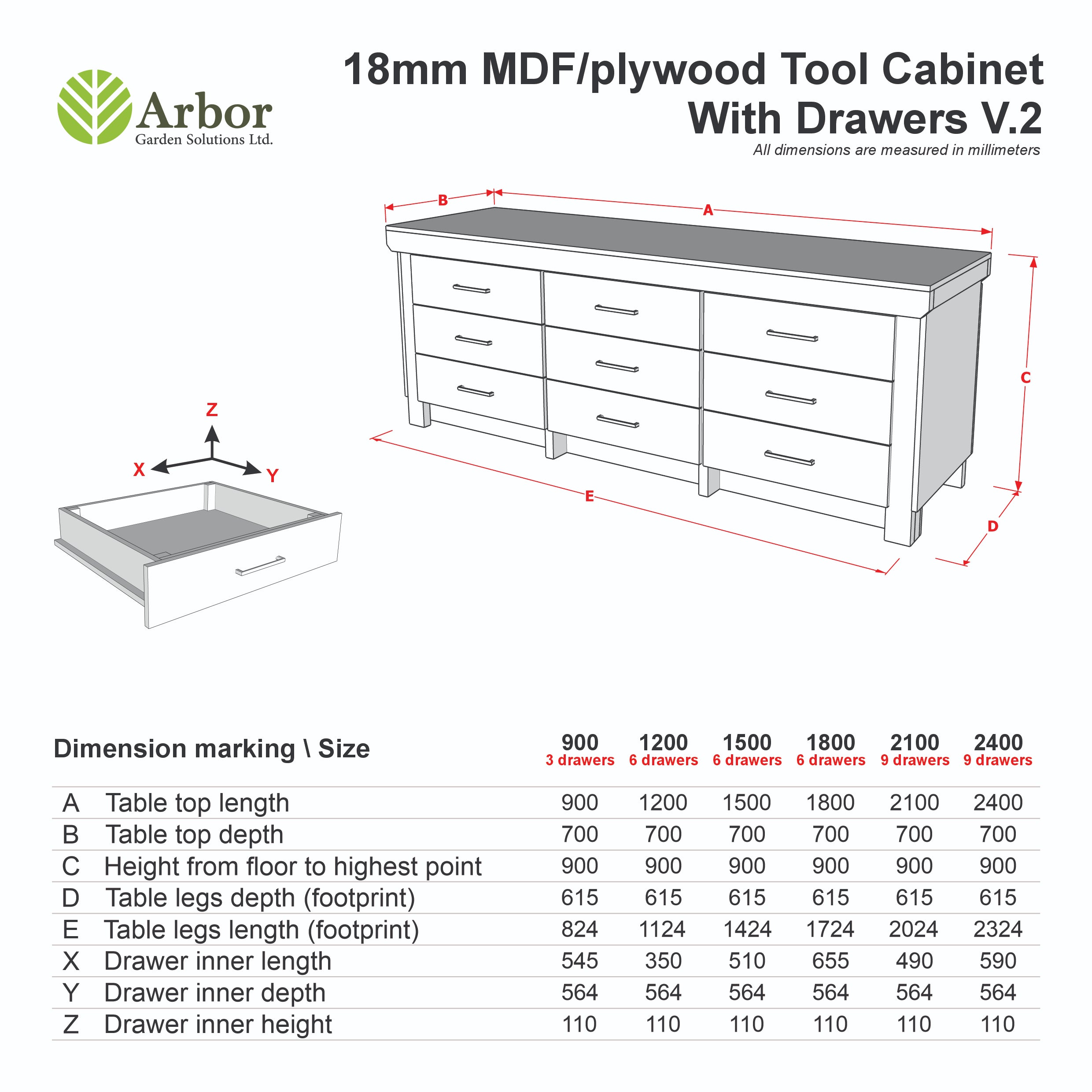Our Tool Cabinet Workbench Wooden 18mm MDF Top is designed to meet the demands of various applications, providing a sturdy and reliable workspace. The frame is constructed from high-quality CLS C16 kiln-dried timber, ensuring structural integrity and longevity. The 18mm MDF work surface offers a smooth and durable platform for all your projects. Depending on the chosen length, the workbench includes up to nine spacious drawers, allowing for organized storage of tools and materials. Handmade in the UK, each bench is supplied in knockdown form for easy on-site assembly, requiring only a screwdriver for setup.