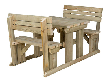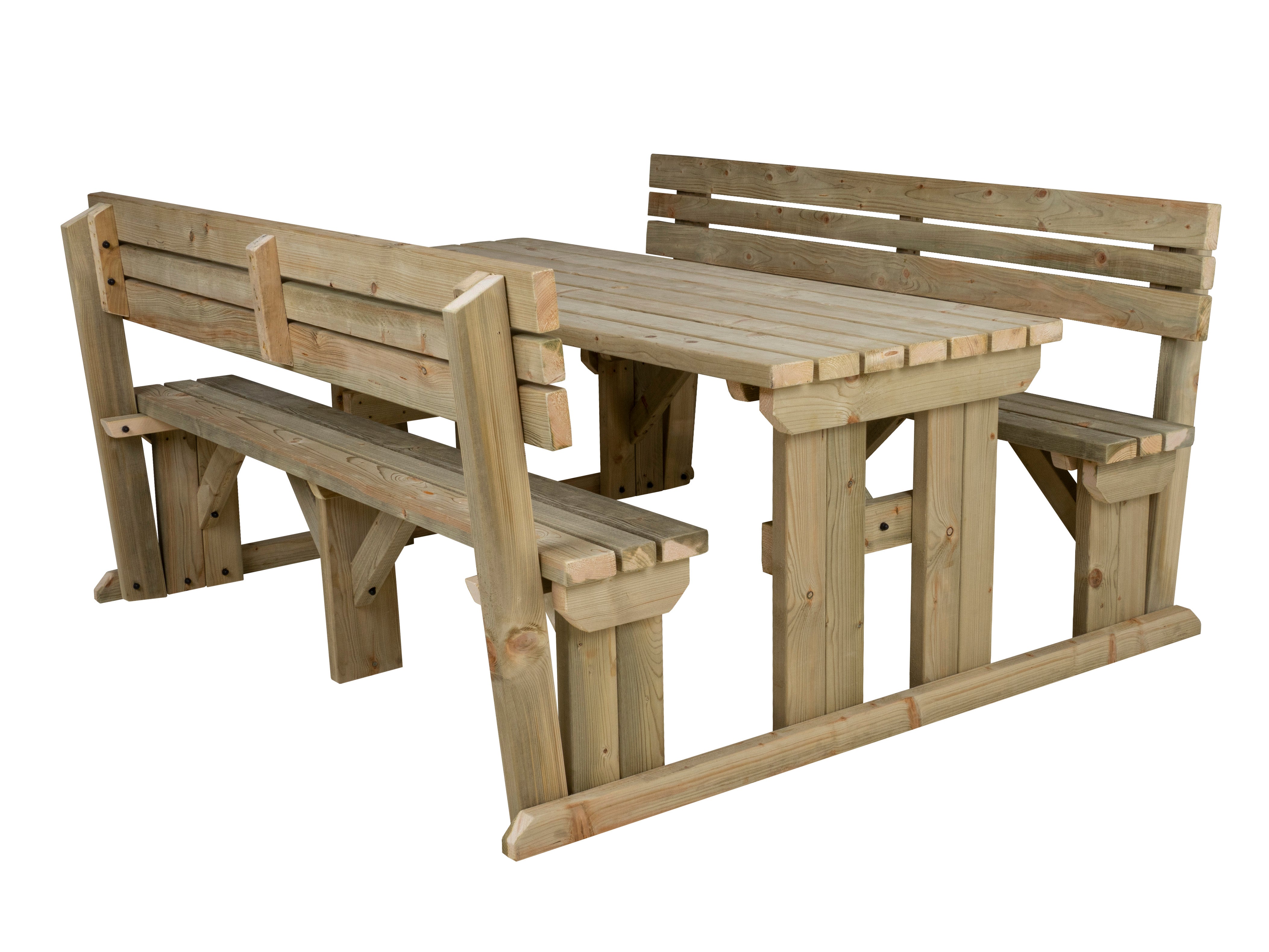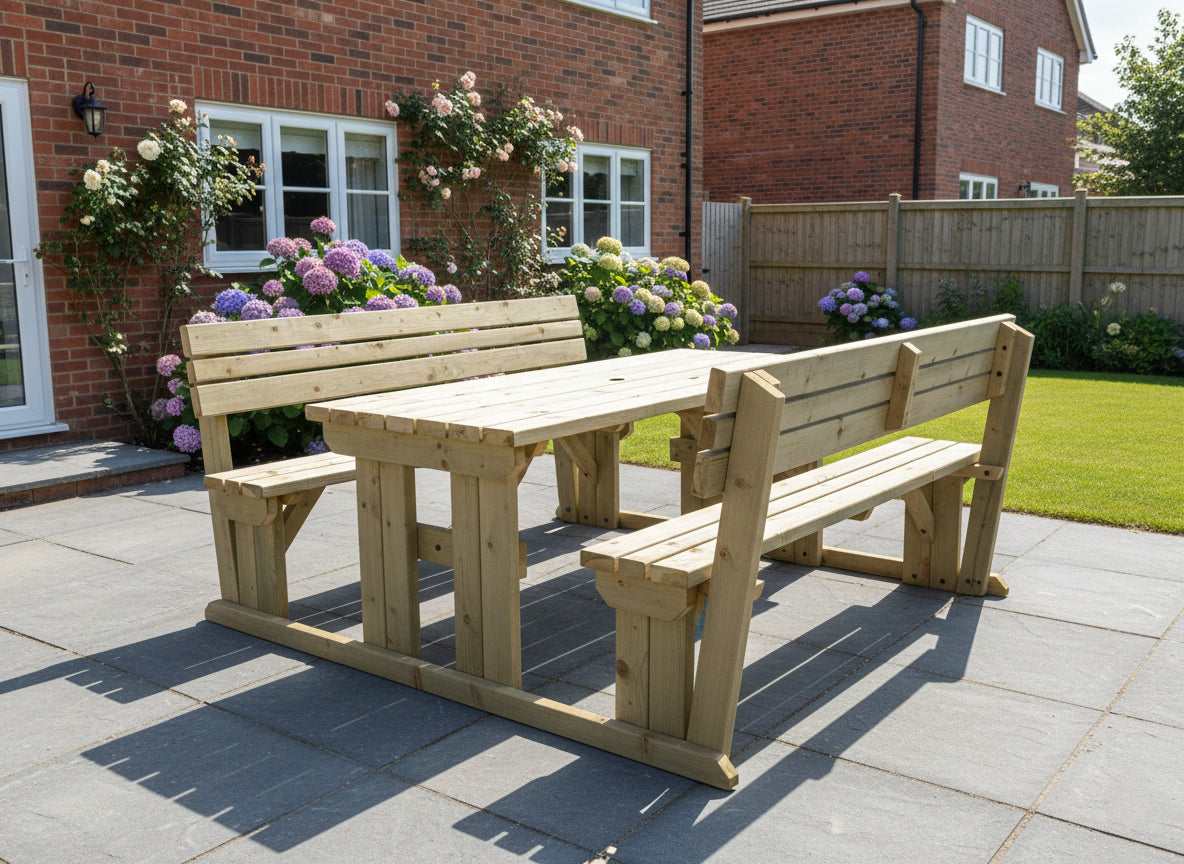 Upgrade your outdoor seating with the Alders Picnic Table & Benches Set with Backrest. This strong, sturdy wooden picnic table is built for gardens, patios, and outdoor dining areas. It is made from heavy-duty, pressure-treated timber and features a 41mm parasol hole and corrosion-resistant fixings for long-term durability. It is perfect for social gatherings, pubs, and family spaces.