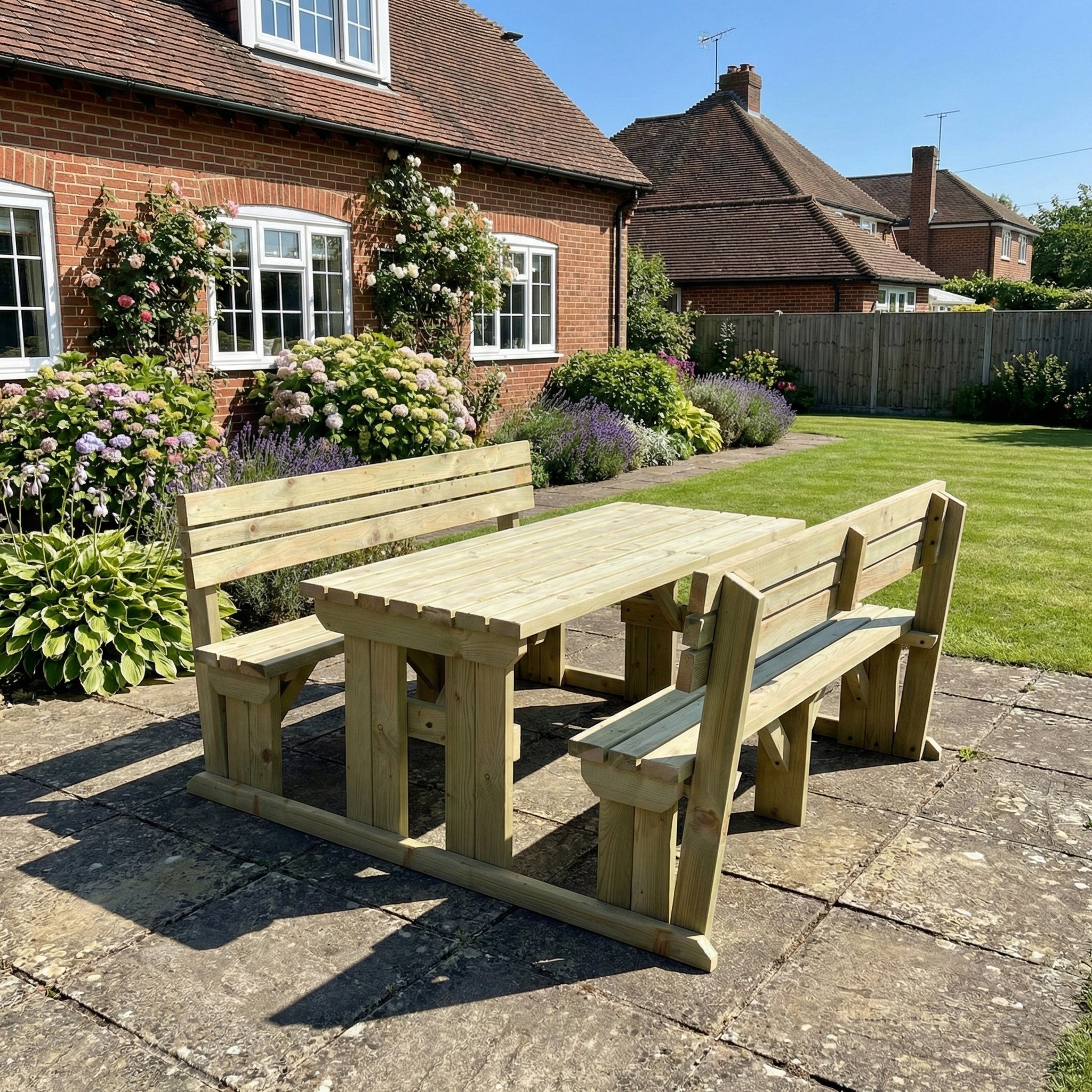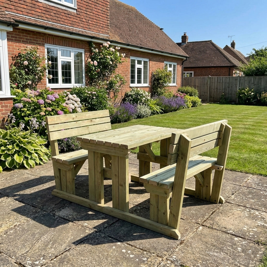 The Alders Picnic Table & Benches Set With Backrest is a sturdy and stylish outdoor seating solution, perfect for gardens, patios, pubs, and picnic areas. Designed to comfortably accommodate 4 to 10 people, this heavy-duty wooden picnic table is crafted from pressure-treated timber (89mm x 38mm / 4" x 2") for long-lasting durability.