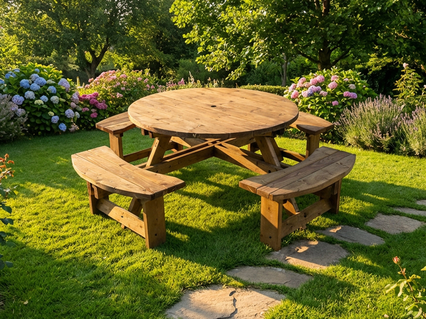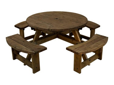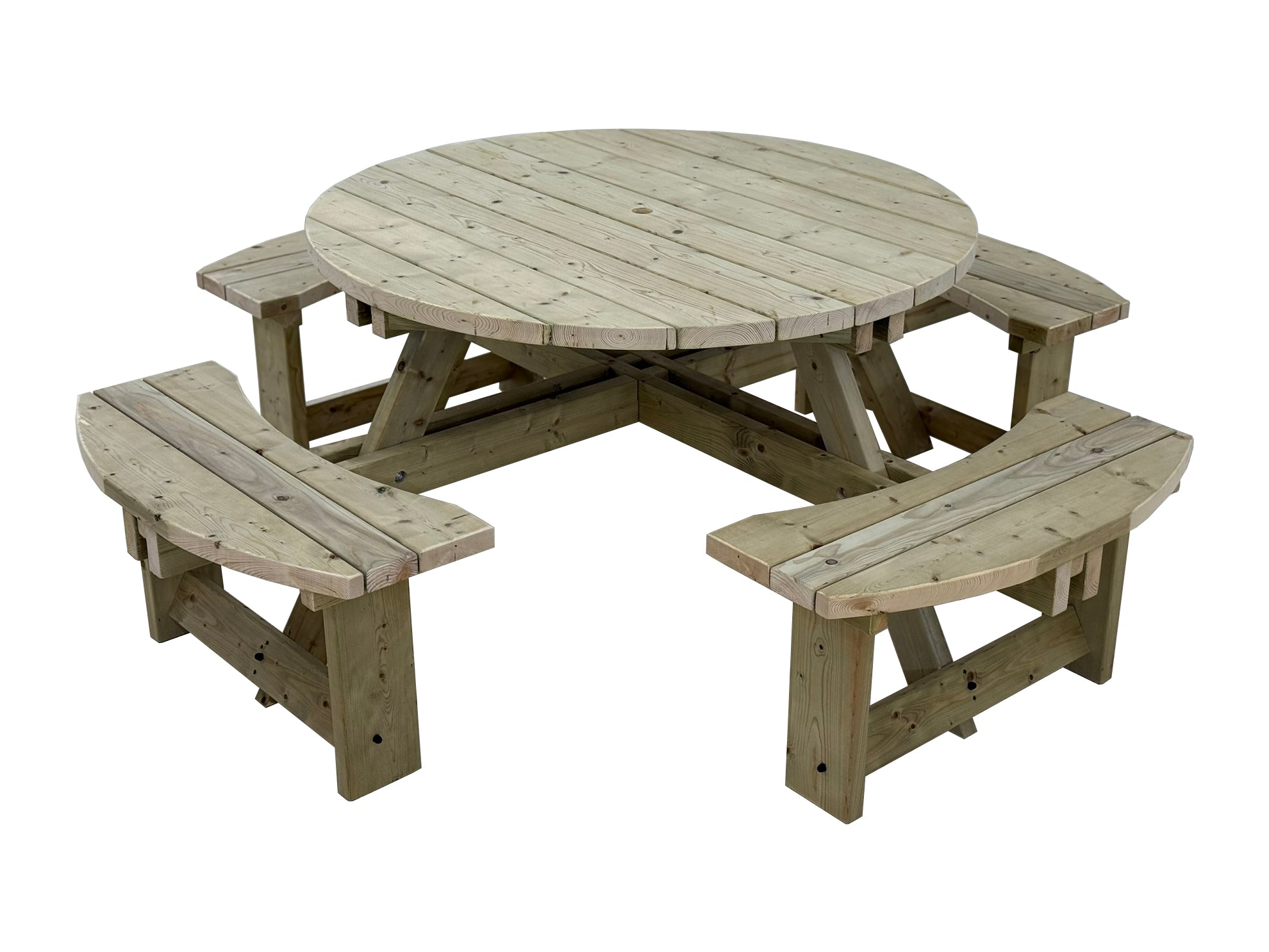 The Meadow Round Picnic Table combines timeless design with robust construction to bring effortless outdoor dining to any garden or outdoor area. Made from premium pressure-treated timber, this round picnic table is built for long-term use and can withstand the elements season after season. Its spacious circular top encourages relaxed gatherings, while the four curved benches offer generous seating for family and friends.
