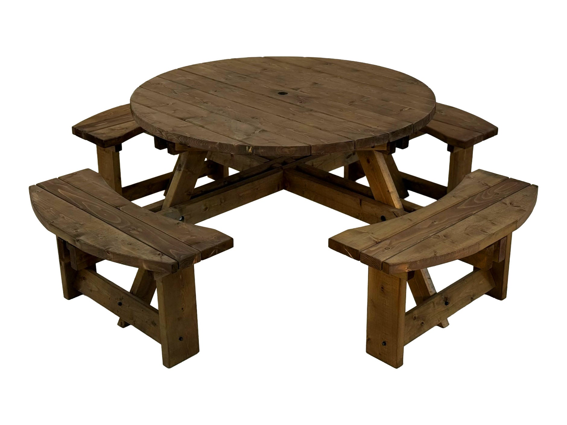 Upgrade your outdoor space with the Meadow Round Picnic Table — a sturdy and stylish timber dining solution ideal for gardens, patios, pubs and social spaces. Crafted from heavy-duty, pressure-treated wood with corrosion-resistant fixings, this classic circular picnic table offers comfortable seating for friends and family. Complete with a parasol hole to provide shade where needed, it’s built to last and perfect for everyday outdoor dining.