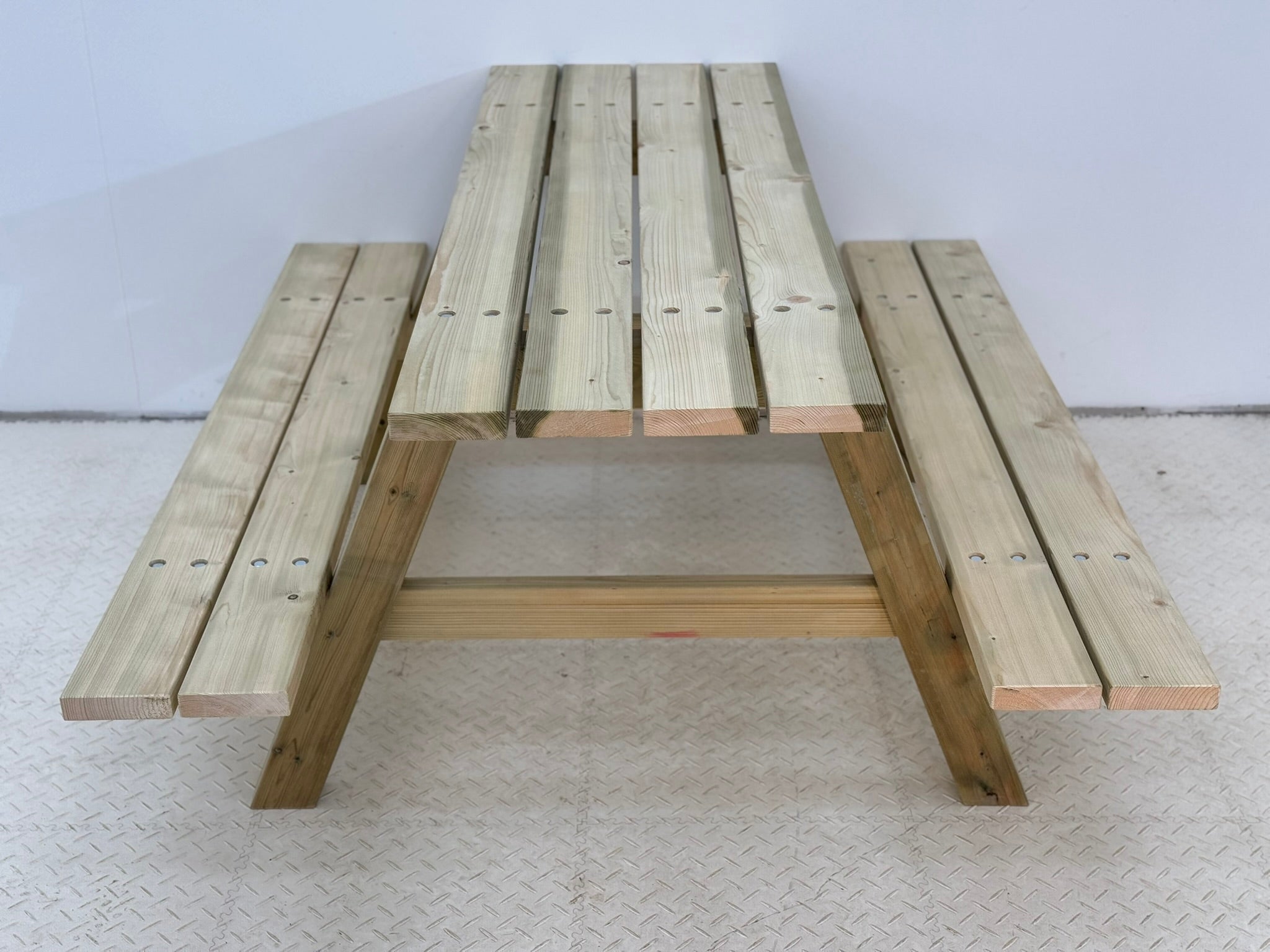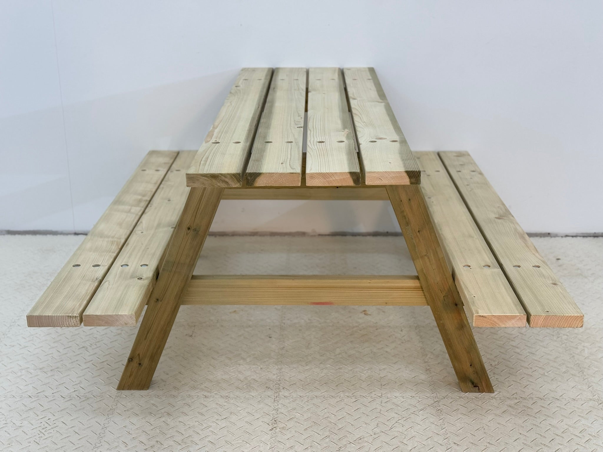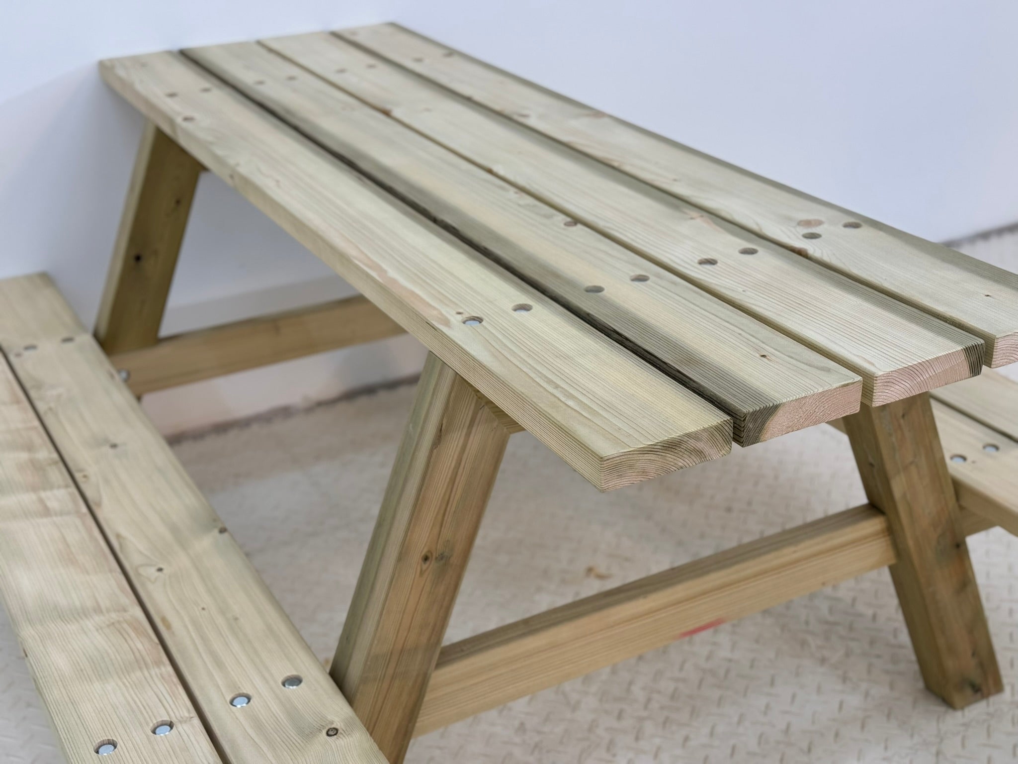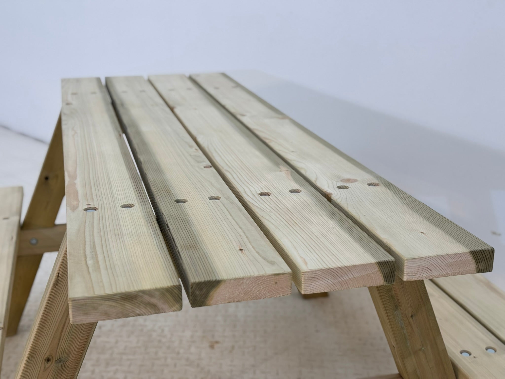 The seating surface is made from 38mm x 130mm construction-grade wooden planks, providing excellent strength and resistance to everyday wear. The heavy-duty leg frame is constructed from substantial 70mm x 100mm timber posts, ensuring stability and long-term performance.