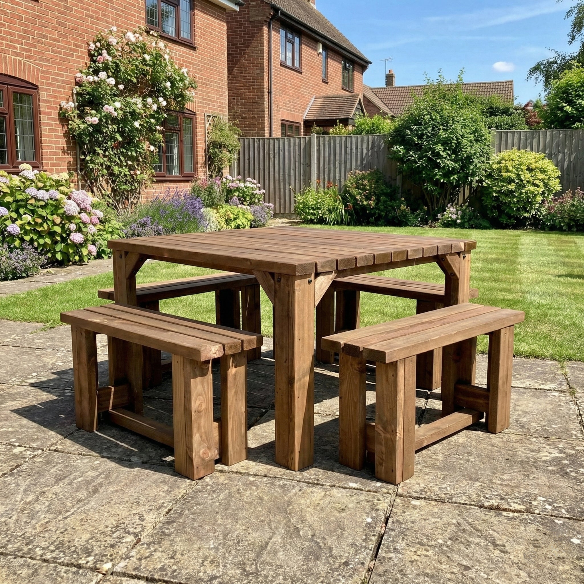 Constructed from heavy-duty, pressure-treated timber measuring 89mm x 38mm (4" x 2"), the QUADRUM set ensures durability and resistance against the elements. It includes a 41mm parasol hole, perfect for adding shade during sunny days. All fixings are corrosion-resistant, and visible bolts are fitted with black cover caps to enhance safety and aesthetics. The timber is sourced from responsibly managed forests, reflecting a commitment to environmental sustainability.