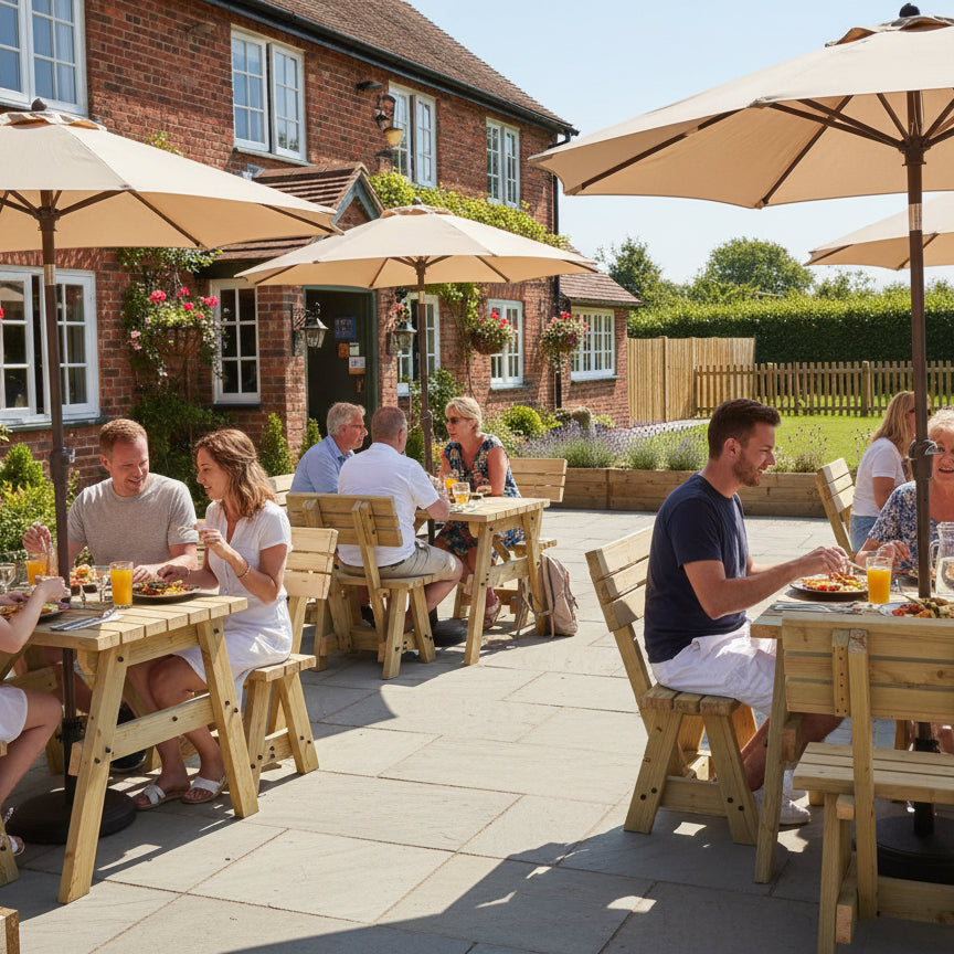 Crafted from heavy-duty, pressure-treated timber (89mm x 38mm / 4" x 2"), this durable wooden picnic table is built to withstand the elements. It features a 41mm parasol hole for shaded outdoor dining, while corrosion-resistant fixings and black cover caps on visible bolts provide added safety and a polished finish.