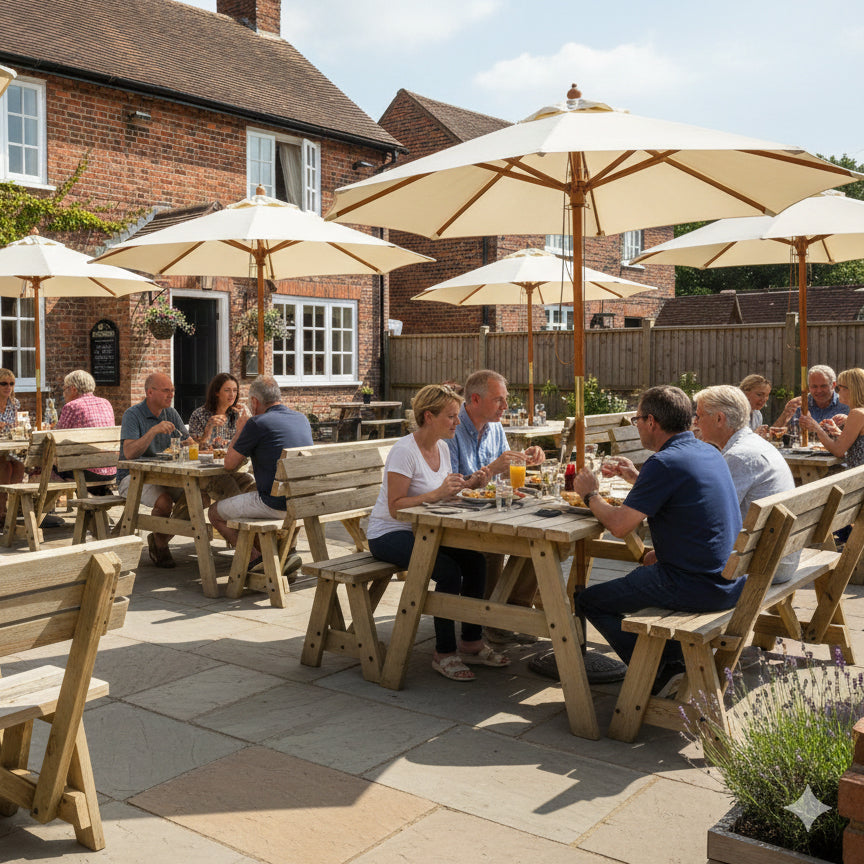 Maximize your outdoor space with the Victoria Space-Saving Picnic Table & Benches Set with Backrest. Designed for gardens, patios, pubs, and outdoor dining areas, this sturdy wooden picnic table features a smart space-saving design, allowing the benches to slide neatly under the table when not in use.