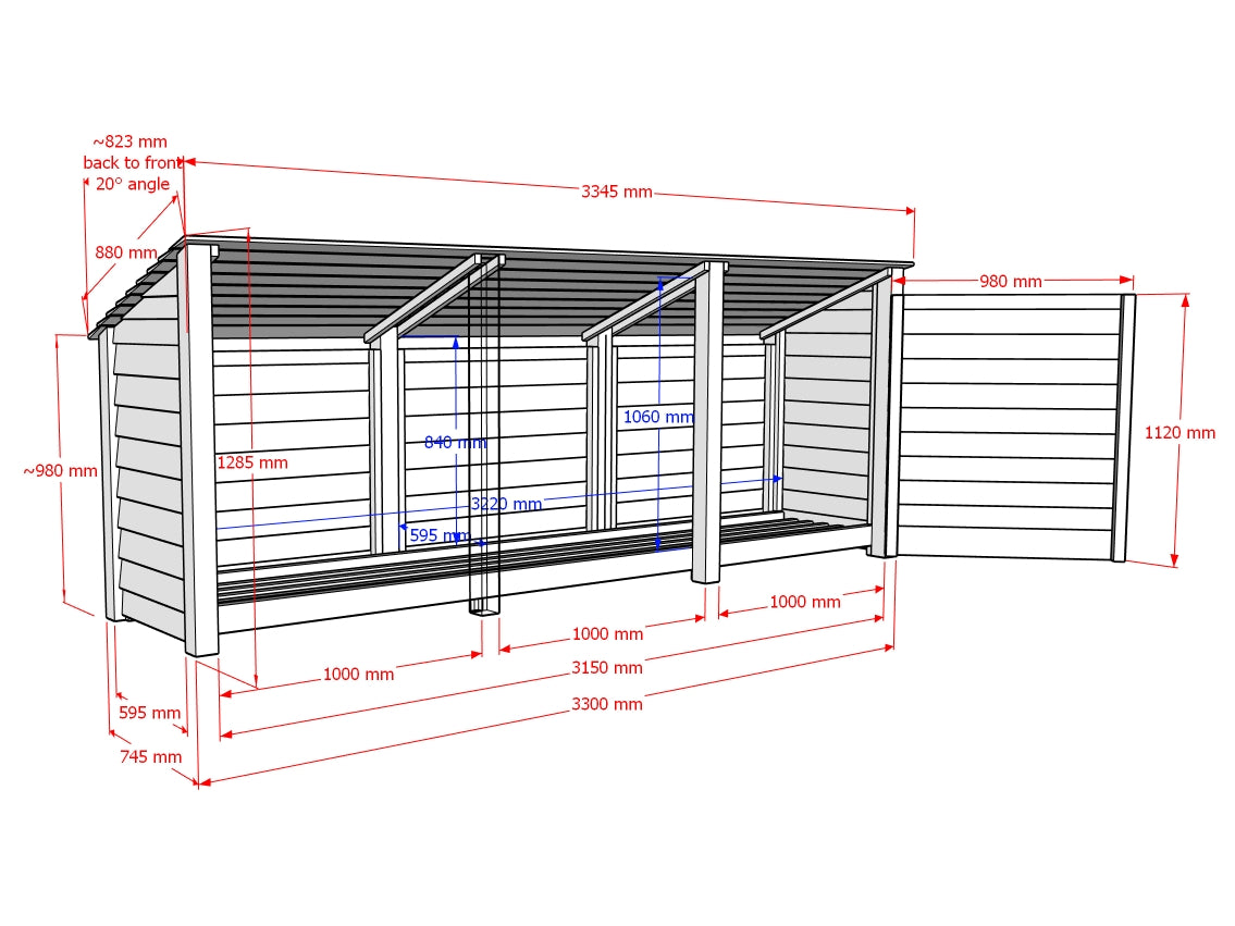 The Triple bay Log Store is engineered for optimal firewood storage and seasoning. Constructed from pressure-treated, construction-grade timber, it ensures durability and resistance to decay. The design features slatted sides and a raised base, promoting air circulation to effectively reduce moisture content in logs. A sloped roof facilitates efficient water runoff, safeguarding the wood from precipitation. All provided fixings are corrosion-resistant, enhancing the structure's longevity. This log store offers a practical solution for maintaining a dry and organized firewood supply.