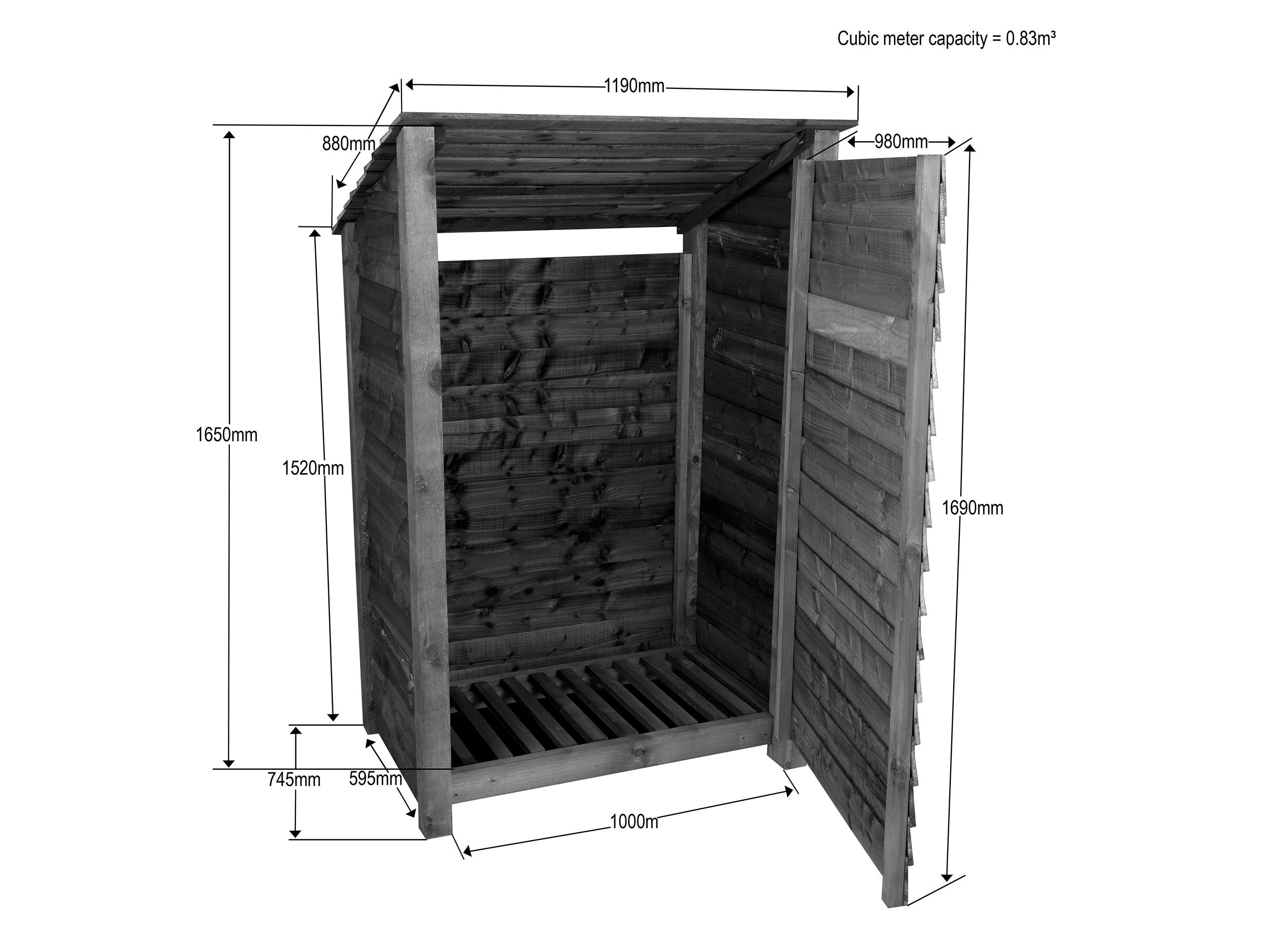 Wooden Log Store (Roof Sloping Back) with Door W-119cm, H-126cm Or 180cm, D-88cm