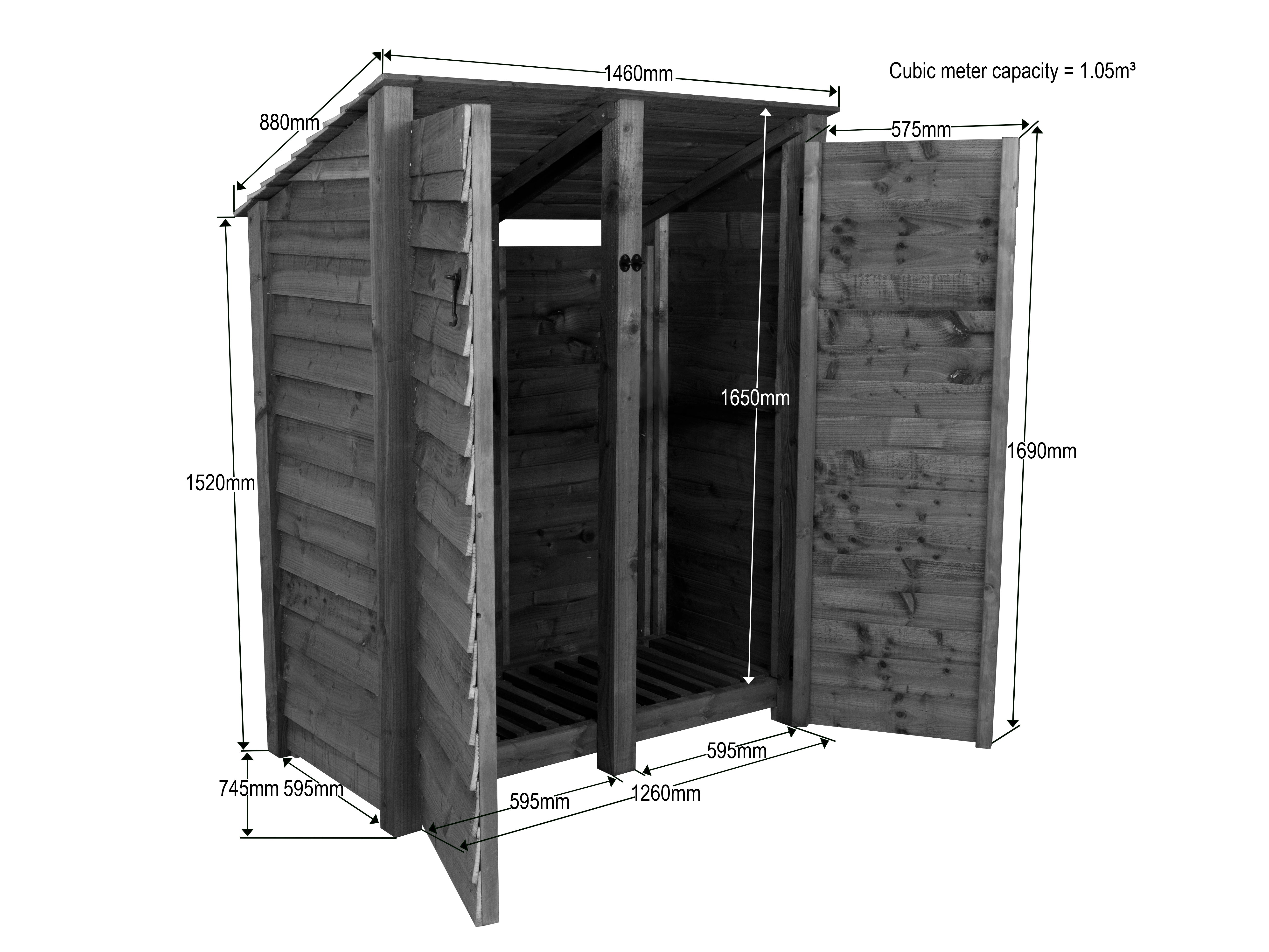 The Double bay Log Store is engineered for optimal firewood storage and seasoning. Constructed from pressure-treated, construction-grade timber, it ensures durability and resistance to decay. The design features slatted sides and a raised base, promoting air circulation to effectively reduce moisture content in logs. A sloped roof facilitates efficient water runoff, safeguarding the wood from precipitation. All provided fixings are corrosion-resistant, enhancing the structure's longevity. This log store offers a practical solution for maintaining a dry and organized firewood supply.