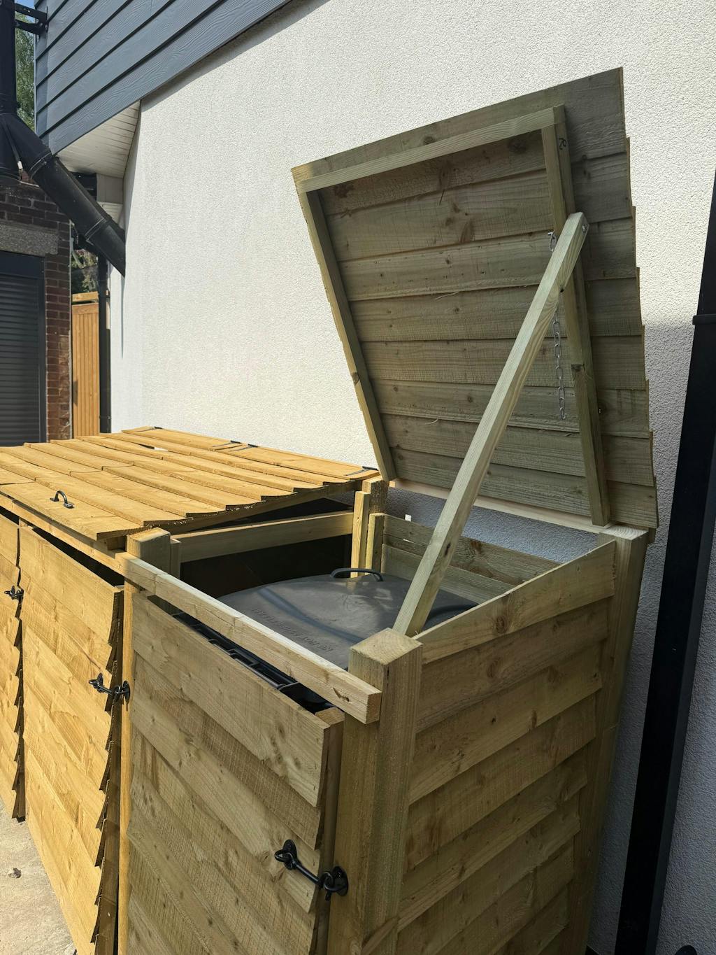 A practical and stylish solution to conceal unsightly bins while ensuring easy functionality in any outdoor setting.