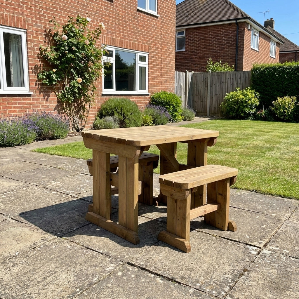 Please note that the benches are 30cm shorter than the overall table length to allow them to slide neatly underneath for convenient space-saving storage.